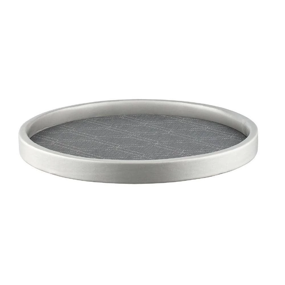Kraftware Designer Vinyls show a new sophistication in color, texture, and style. Stonehenge has a texture resembling fabric with a distinctive geometric design, offered here in a dark gray. Stonehenge Midnight 14 in. Round Serving Tray is accented with a gray gallery rim.