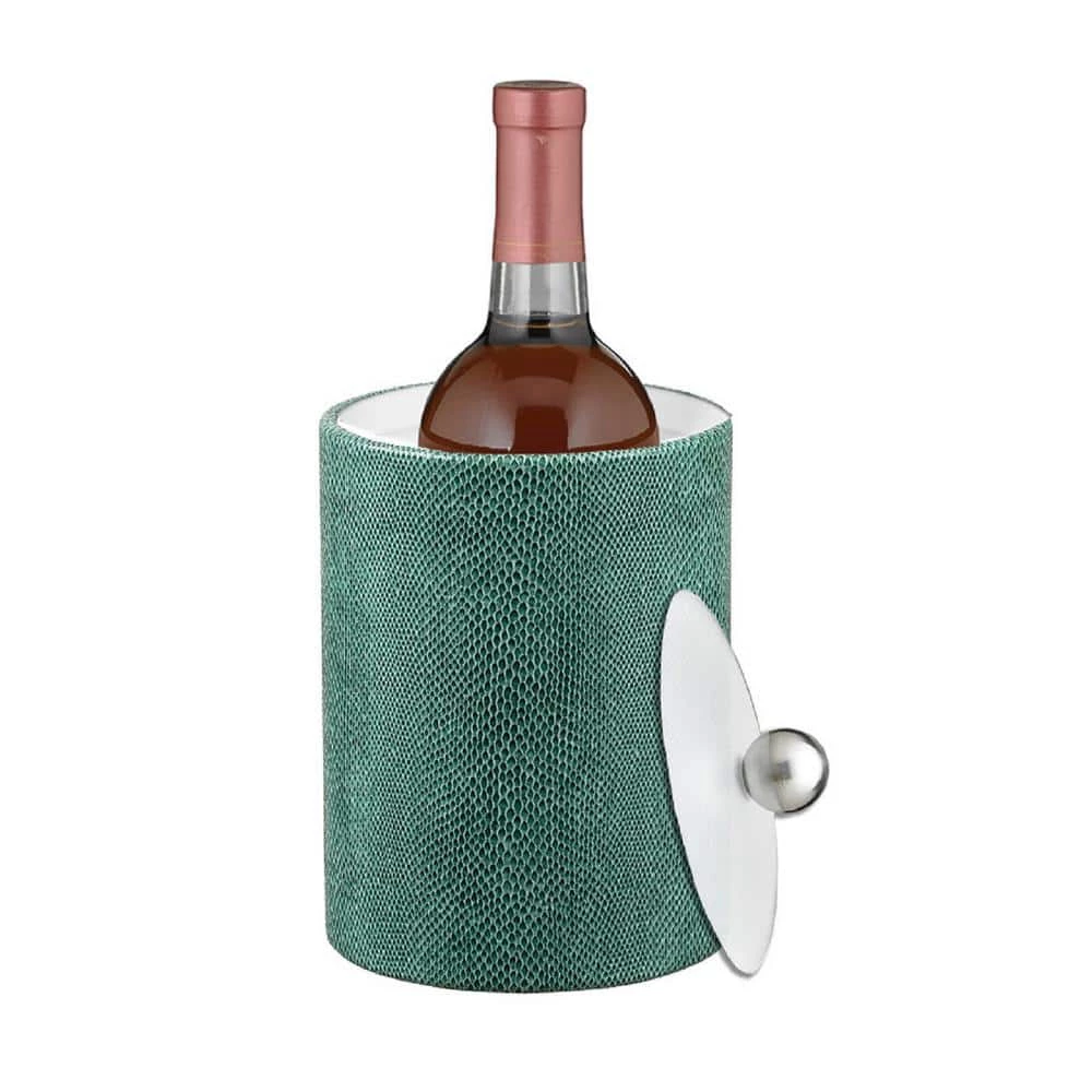 Kraftware Designer Vinyls show a new sophistication in color, texture, and style. Our Exotics have the appearance of colorful snake skin in fine detail. 2 qt. Exotic Peacock Tall Ice Bucket includes an acrylic lid with metal ball knob. Doubles as a bottle cooler.