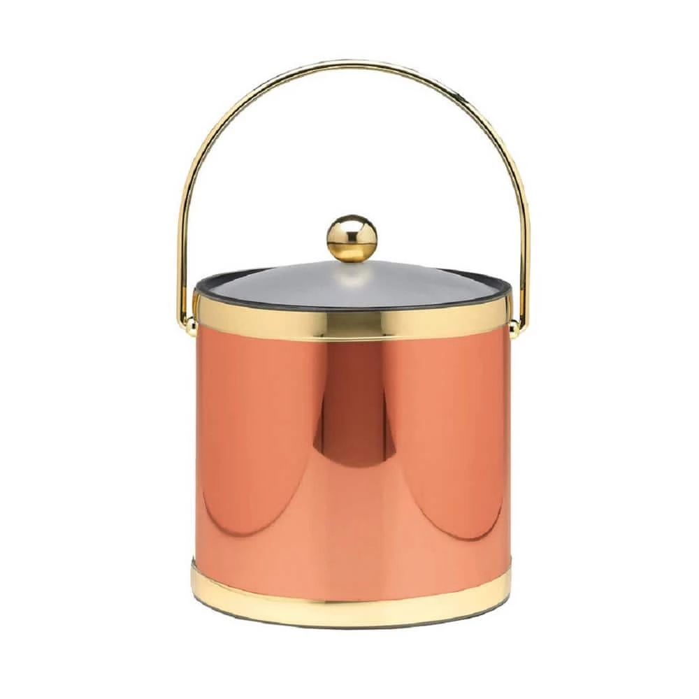 Kraftware Classics Mylar Collection offers high style in classic designs. This 3 Qt. Ice Bucket is wrapped in Mylar in a polished copper finish with brass accent bands. Ice bucket has a bale handle, and an acrylic cover with a brass ball knob.