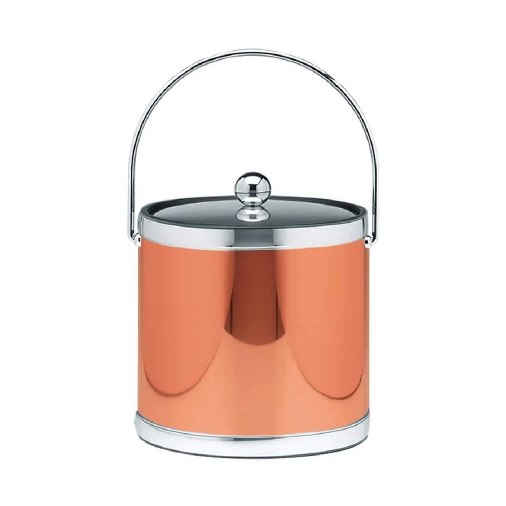 Kraftware Classics Mylar Collection offers high style in classic designs. This 3 Qt. Ice Bucket is wrapped in Mylar in a polished copper finish with chrome accent bands. Ice bucket has a bale handle, and a metal lid with a chrome ball knob.