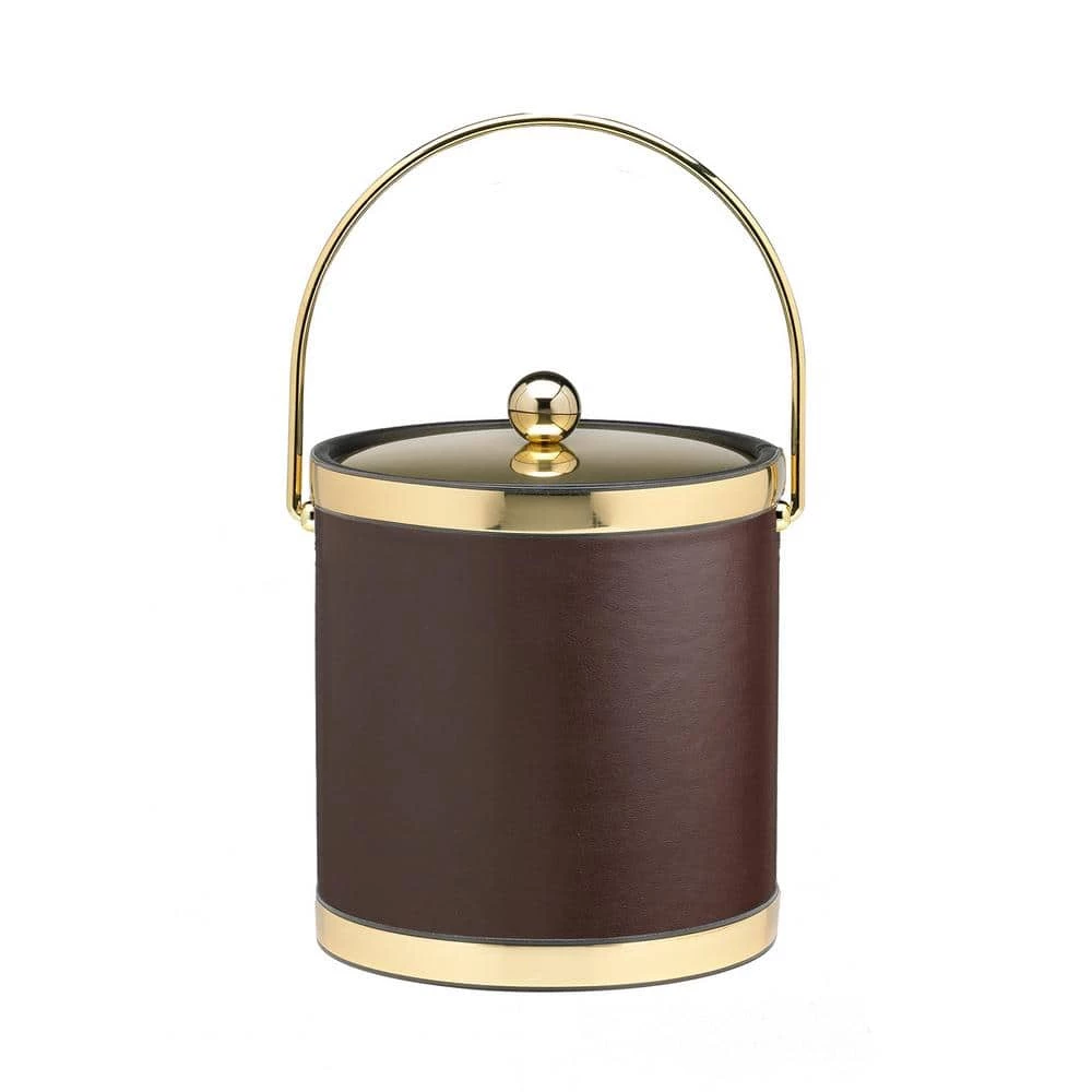 Always in style, the classic designs of Kraftware Sophisticates are perfect for any occasion. This collection features high quality leatherette vinyl with elegant metallic trim. Insulated 3 Qt. Brown Ice Bucket has a bale handle and metal lid with a ball knob, with all accents in polished brass. Case includes 6 ice buckets.